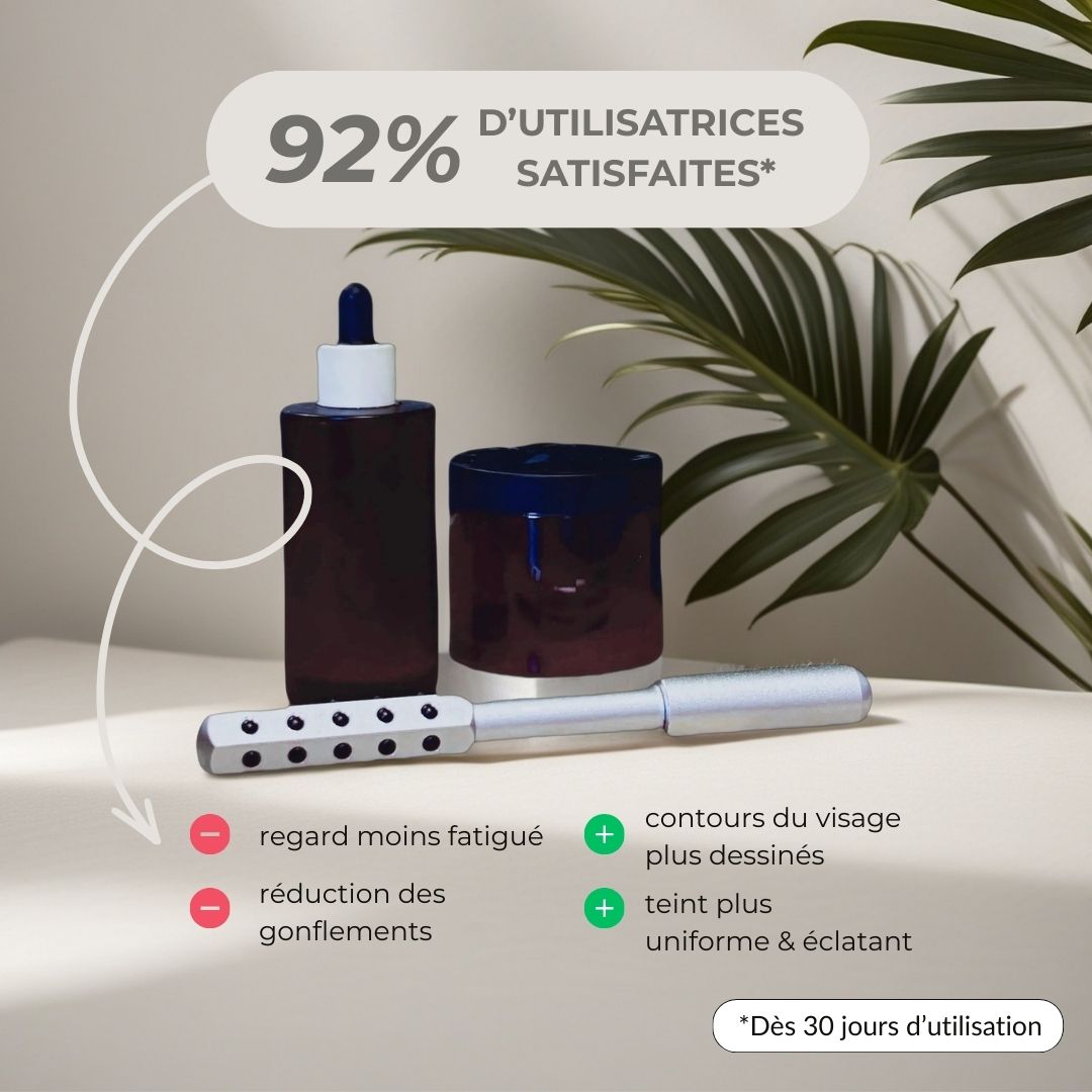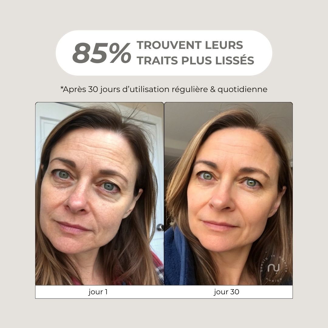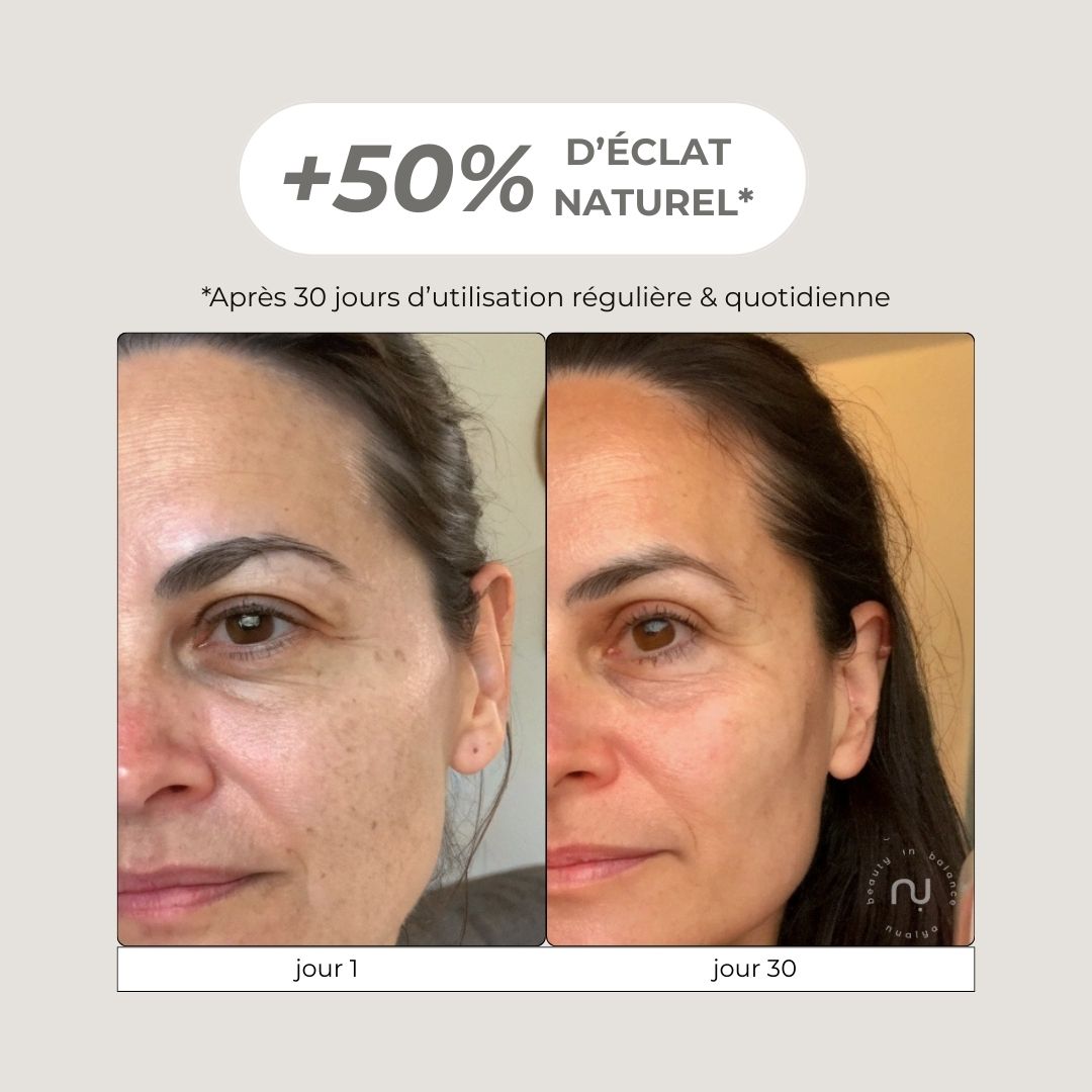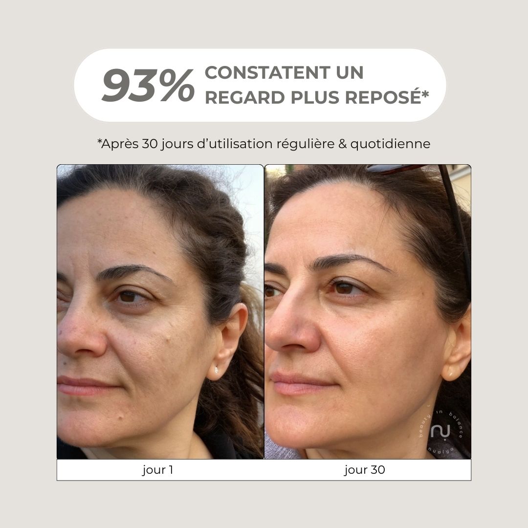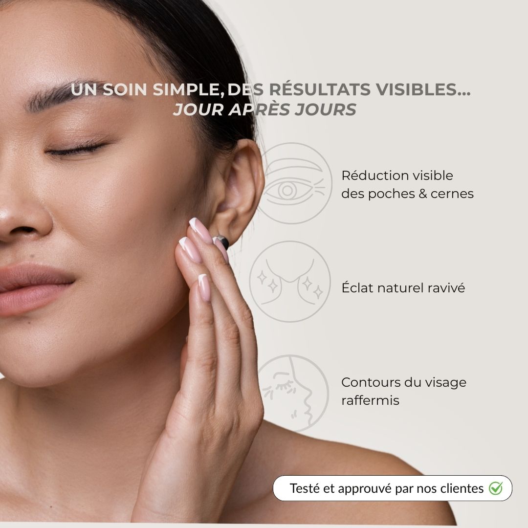 Les effets peuvent se faire sentir dès la première utilisation : traits plus détendus, sensation de fraîcheur. La majorité des utilisatrices remarquent un teint plus frais et un regard moins fatigué en moins de 10 jours.